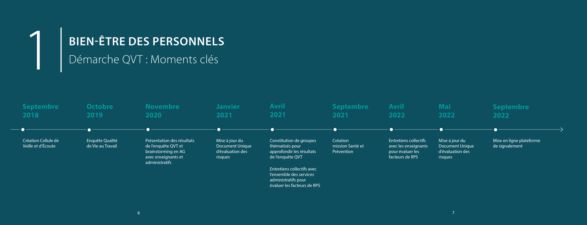 Premier point à rappeler : les étudiants de Sciences Po Bordeaux estiment majoritairement que leur santé est « bonne ou excellente » (57%). À l’inverse, 1% seulement la considère « mauvaise », 12% « fragile » et 30% « moyenne ». Néanmoins, de nombreux chiffres interpellent à juste raison la communauté pédagogique, notamment parce qu’ils sont en hausse par rapport à 2020. Ainsi, 52% disent se sentir « angoissés souvent voire en permanence » (+4%), 38% « dépassés souvent voire en permanence (+6%) » et 16% « seuls souvent voire en permanence » (+7%). Un dernier chiffre montre l’acuité de la situation : 17% des élèves qui ont répondu affirment avoir « souffert d’idées suicidaires » et ce, bien avant la chanson L’enfer de Stromae. Autant d’indicateurs qui expliquent la mobilisation de l’école. « Sciences Po Bordeaux se préoccupe de la santé physique et psychique de ses étudiants depuis des années. Il est indéniable que la crise sanitaire, et plus largement les tensions sociétales, ont poussé l’établissement à amplifier et à accélérer ses actions » explique Laetitia Hippeau. La jeune femme, psychologue du travail et de l’orientation, a intégré l’établissement en 2016. Elle est soutenue par une équipe au sein de laquelle on peut citer Floriane Reilhan, ingénieure prévention des risques et développement durable, et Christophe Prévot, chargé de la vie étudiante et associative. Mais ce sont bien tous les services internes en lien avec les étudiants qui sont mobilisés, de la scolarité au pôle carrière et partenariat. A l’image de la frise ci-dessous, une dizaine d’actions phares ont été mises en œuvre ces dernières années à travers un dispositif qui s’étoffe d’année en année et résumé dans le bilan Qualité de Vie au Travail (QVT) 2022 de l’école.