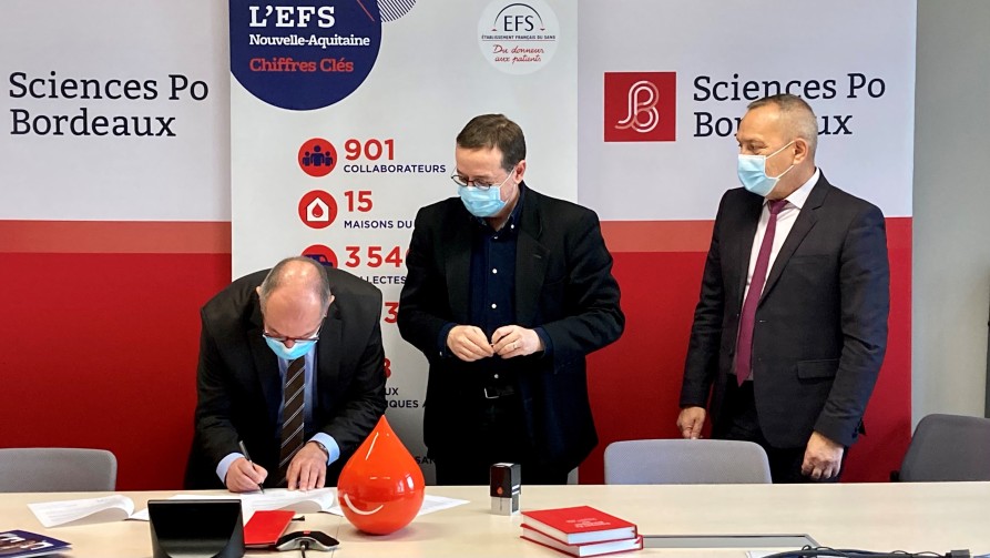 La signature a eu lieu vendredi 3 décembre dans les locaux de l’Institut. Un moment fort en émotion, tant pour l’équipe de Sciences Po Bordeaux que pour le Président de l’Établissement Français du Sang, François Toujas, diplômé de l’école (promotion 1979).