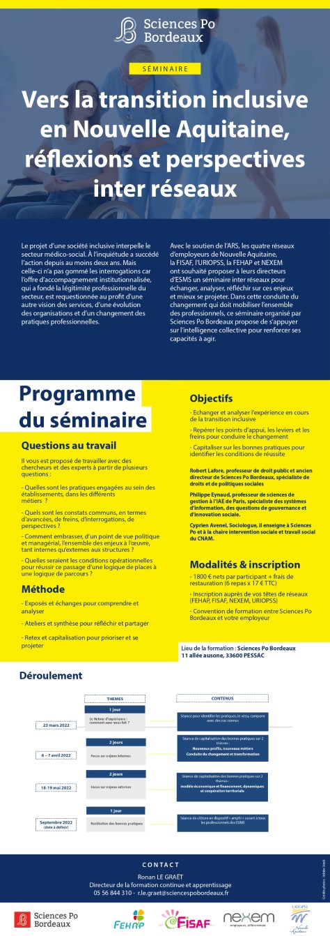 Comment aborder au mieux ce changement ? Quels outils appliquer ? De nouveaux métiers doivent-ils être développés ? C’est pour répondre à ces questions et faire face à ce contexte charnière que Sciences Po Bordeaux accueille le séminaire « Vers la transition inclusive en Nouvelle Aquitaine » de mars à septembre 2022. Avec le soutien de l’ARS, les quatre réseaux d’employeurs de Nouvelle Aquitaine, la FISAF, l’URIOPSS, la FEHAP et NEXEM, partenaires et co-organisateurs, ont souhaité proposer à leurs directeurs d’ESMS (Établissements et Services Médico-Sociaux) un séminaire inter réseaux pour échanger, analyser et réfléchir ensemble à ces enjeux.