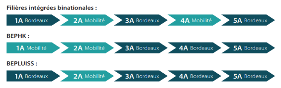 - Binational English Programme Hong-Kong (BEPHK, cursus en langue anglaise, pratique du mandarin au cours de la scolarité antérieure obligatoire (équivalent A2) et suivi impératif du chinois en LVB durant toute la scolarité à Sciences Po Bordeaux),